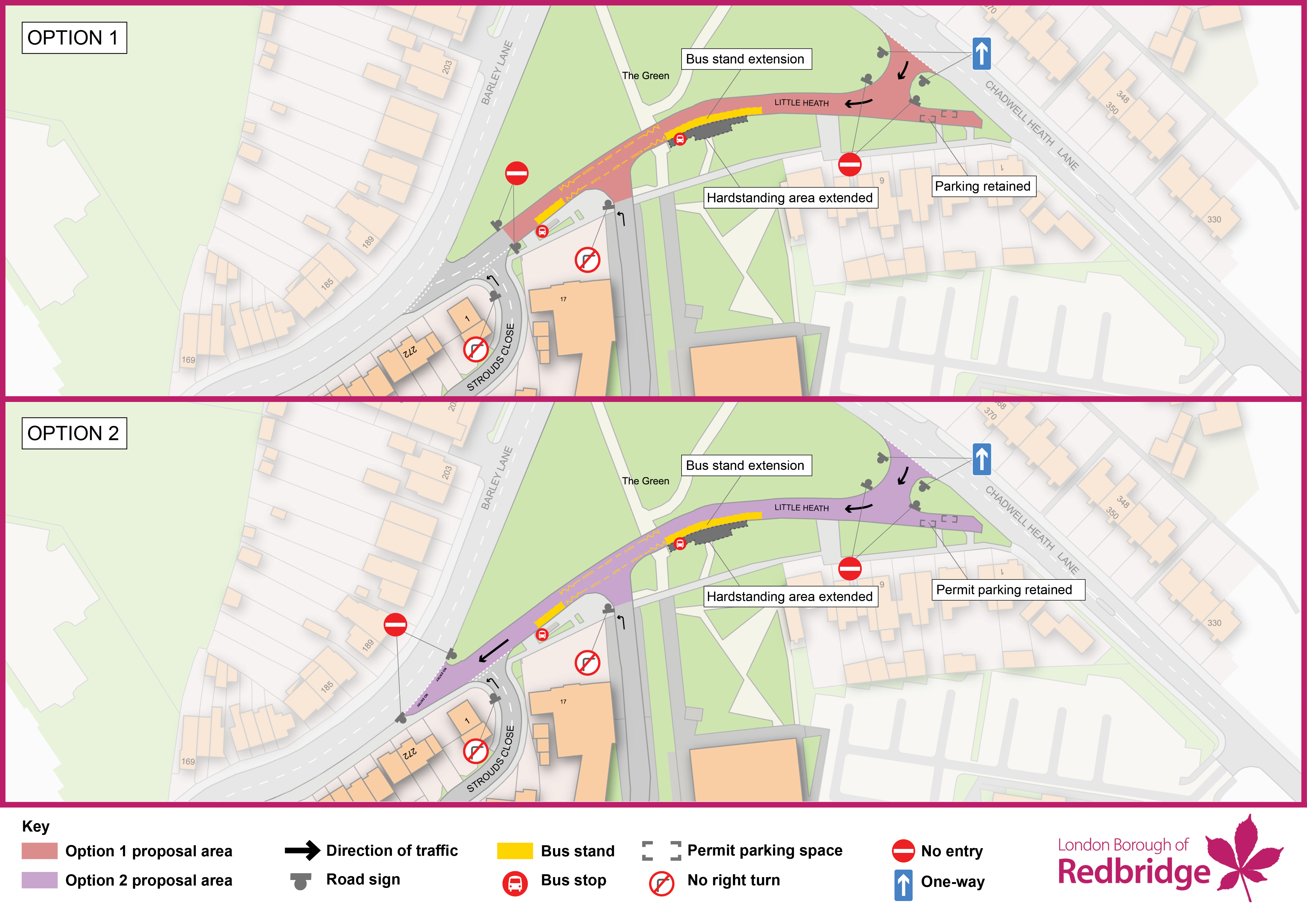 To support the improved operation of the EL3 bus stand and overall traffic flow, the Council is considering introducing a one-way westbound layout on Little Heath. Two options are being presented for consultation: